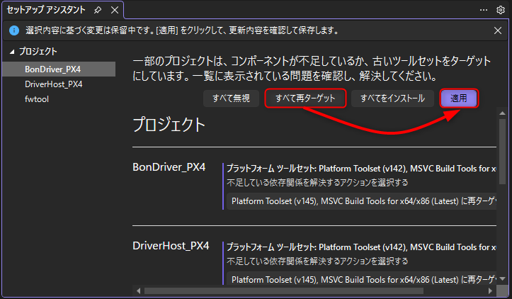 Visual Studio 2026で「セットアップアシスタント」が出た場合は「すべて再ターゲット」を選んで「適用」をクリックします。